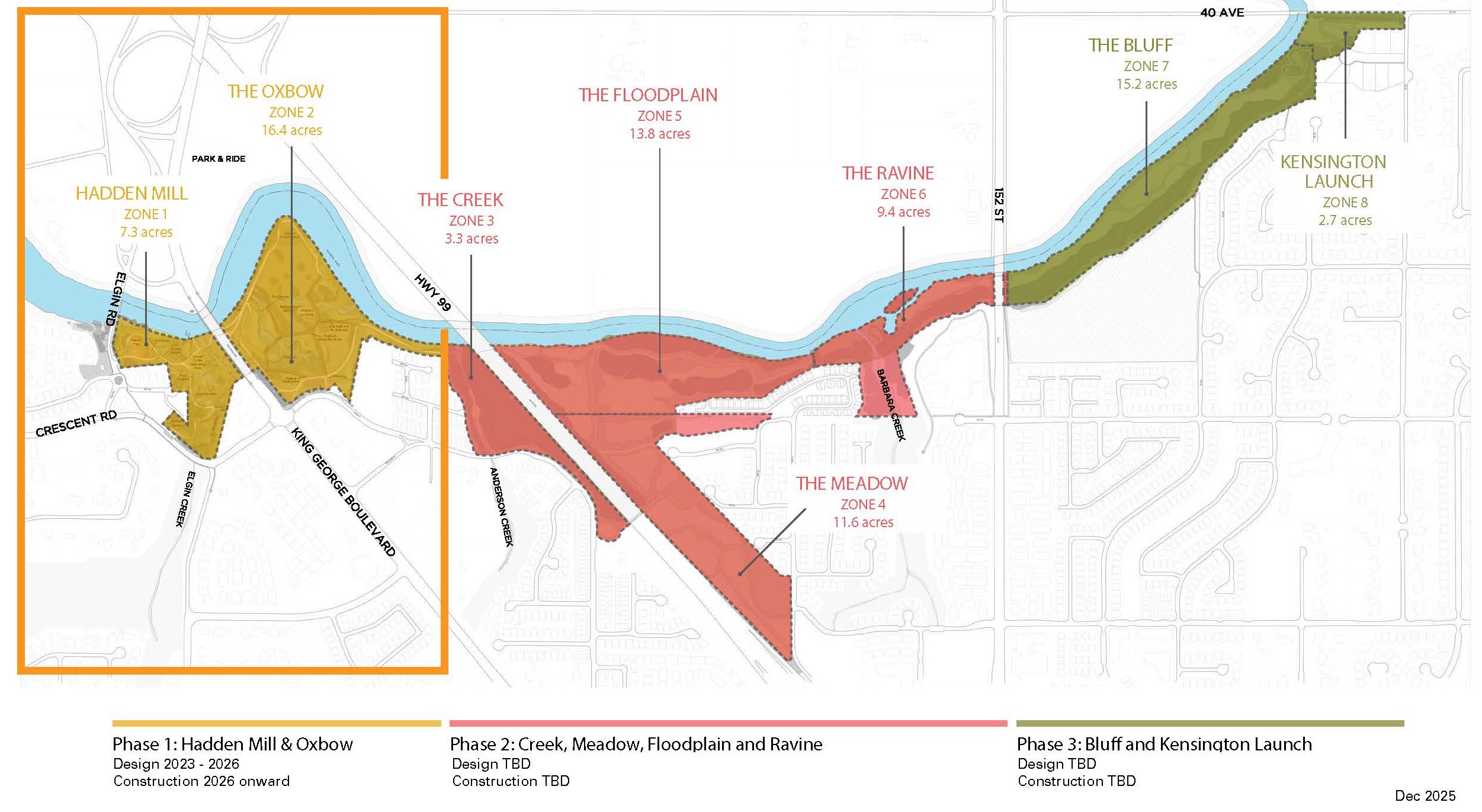 The project is being developed in three phases. The City is currently working on the detailed designs for phase one, the largest area (24 acres) of the project, known as the Hadden Mill and Oxbow zones, which are located on either side of King George Boulevard. Once complete, the design concept plan and drawings will be presented to the community for input in early 2023.